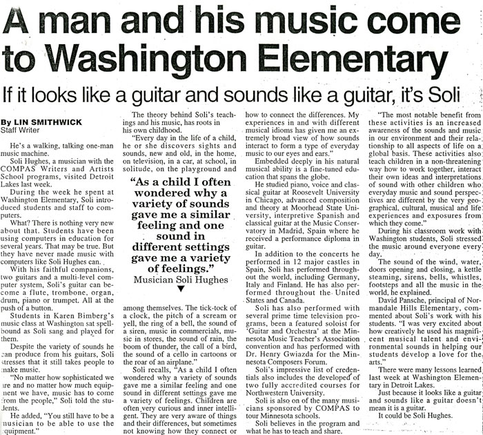 Soli Hughes, a musician with the COMPAS Writers and Artists School programs, visited Detroit Lakes last week. During the week he spent at Washington Elementary, Soli introduced students and staff to computers.